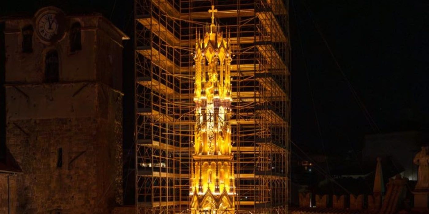 Al calar del sole, tutte le luci della città vengono spente. Strade e piazze piombano nel buio, finché la torre, costellata di centinaia di luci elettriche e candele, non inizia il suo lento cammino luminoso, rischiarando le facciate dei palazzi e il mare di spettatori.