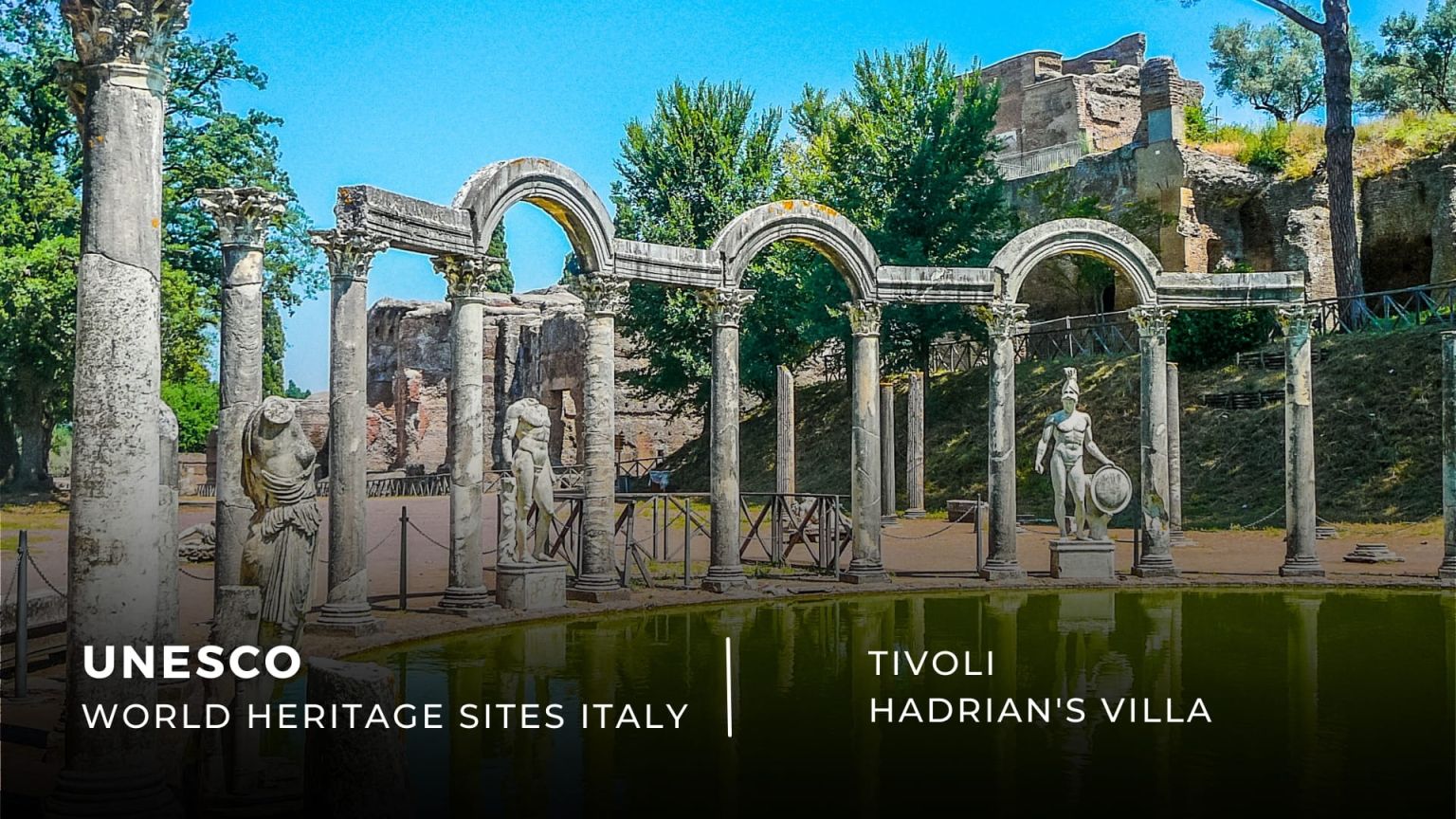Inserita nel 1999 nei siti Patrimonio dell'Umanità UNESCO, Villa Adriana sorge nel comune di Tivoli in Provincia di Roma tra le pendici dei Monti Tiburtini e la campagna romana. Come il nome stesso lascia intuire, fu la residenza extraurbana dell’imperatore Adriano che scelse un territorio verde e ricco di acque nell’antica Tibur.